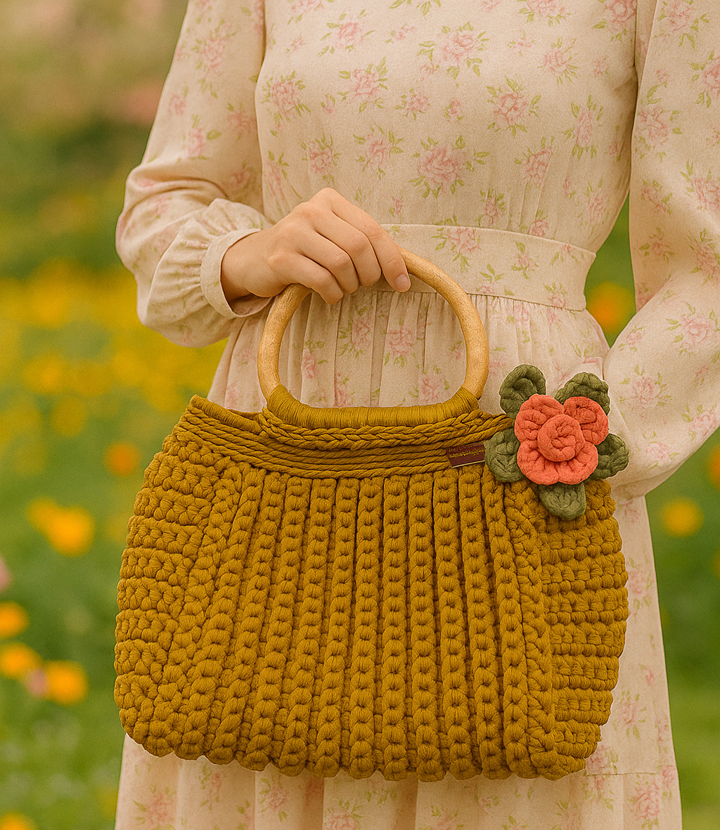 Bolsa Verônica G – Elegância Natural com Toque Artesanal A Bolsa Verônica G é uma peça encantadora, feita para mulheres que amam sofisticação, delicadeza e autenticidade. Produzida artesanalmente em fio de malha estruturado, ela combina textura firme com um design único, realçado pela charmosa flor em crochê aplicada à mão. Seu tom mostarda é moderno e versátil, ideal para compor looks românticos, vintage ou contemporâneos com originalidade. As alças em madeira natural proporcionam firmeza e um toque rústico-chique que transforma qualquer produção. Destaques do produto: • Tamanho G – ideal para quem precisa de espaço sem abrir mão do estilo • Fio de malha premium, encorpado e resistente • Detalhe de flor artesanal aplicada • Alças redondas em madeira natural • Cor: Mostarda com flor em tons terrosos • Design exclusivo, feito à mão 🌼 Uma bolsa que carrega o frescor da natureza, a delicadeza do feito à mão e o charme das flores em cada ponto.