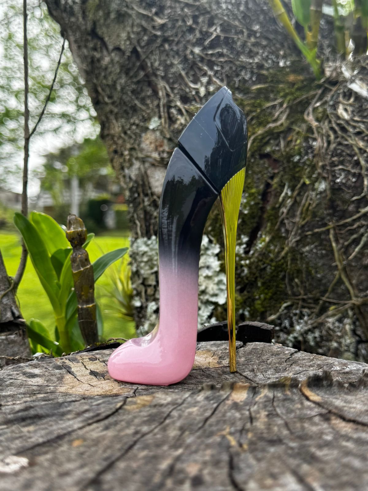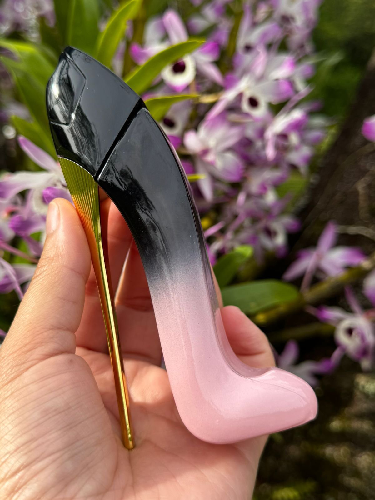O frasco icônico em formato de salto alto ganha um toque especial no degradê rosa, simbolizando charme, feminilidade e poder.